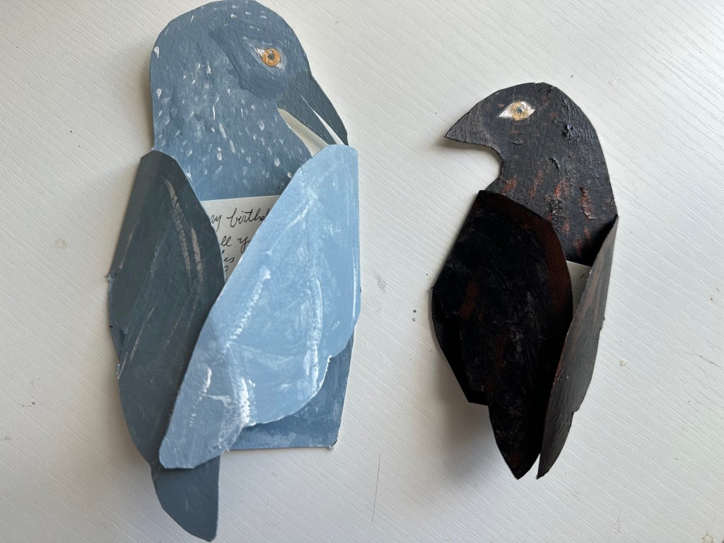 This was a fun project making bird-shaped greeting cards. Do you have a favorite bird? Would you like to see it as a custom card? Message me if you have a request! $9 per card, or 5 for $40.
