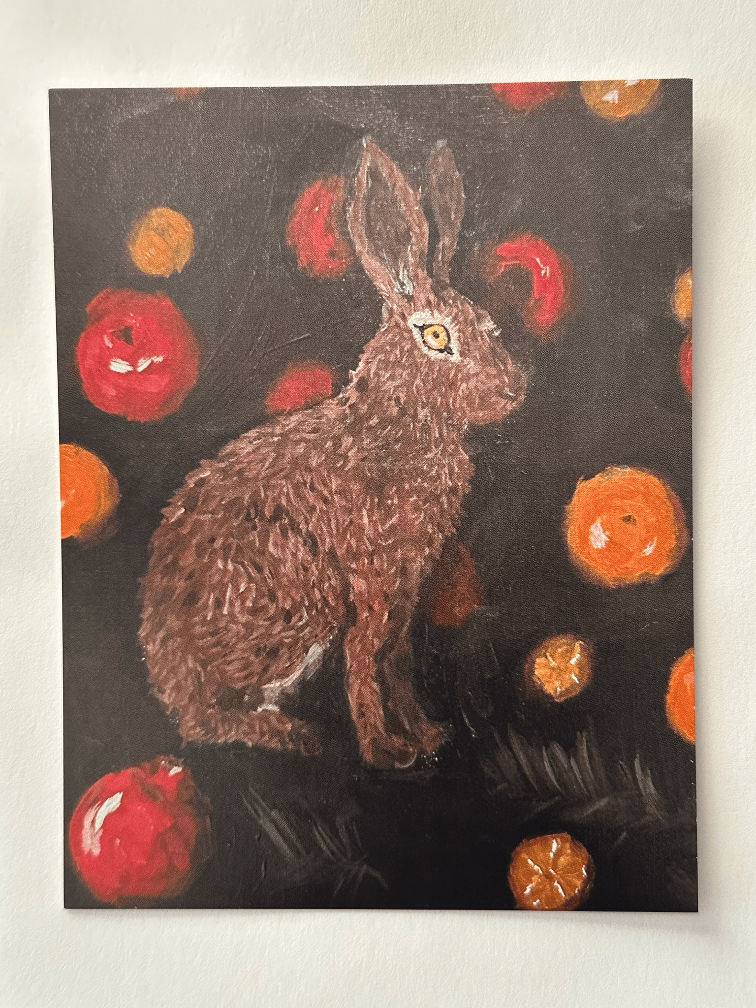 A 5×7 postcard featuring a rabbit and fruit with a matte finish.